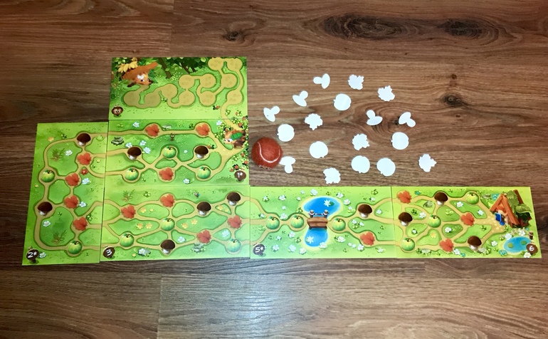 В начале игры прокладываем лесные тропы, как нам захочется, но главное начать со стартового поля с ежиком, а поле с лисьей норой выложить сверху над ним, заканчиваем полем с ежиным коттеджем.