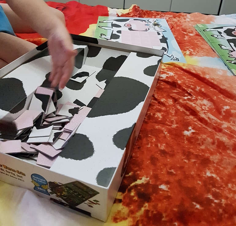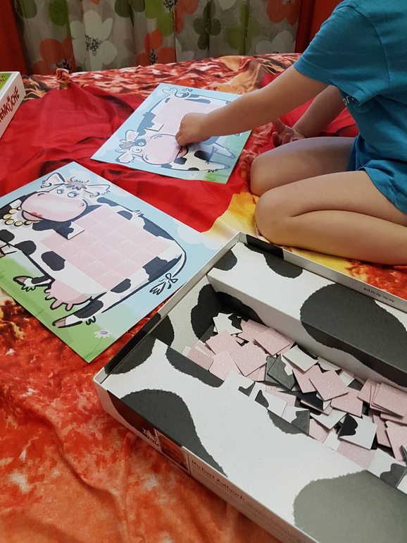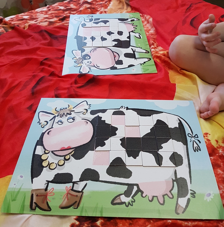 Возраст указан производителем от 4 лет. Думаю, так и есть. Разве что особо одаренным детям можно раньше. Нашему любителю пазлов ещё рано играть в эту игру. Слишком сложно. Мы пока просто пособирали коров с моей помощью. Посмотрим, как дальше пойдет, будет ли доставать сам игру. Поиграем пока, как в обычную головоломку, без соревновательного режима.