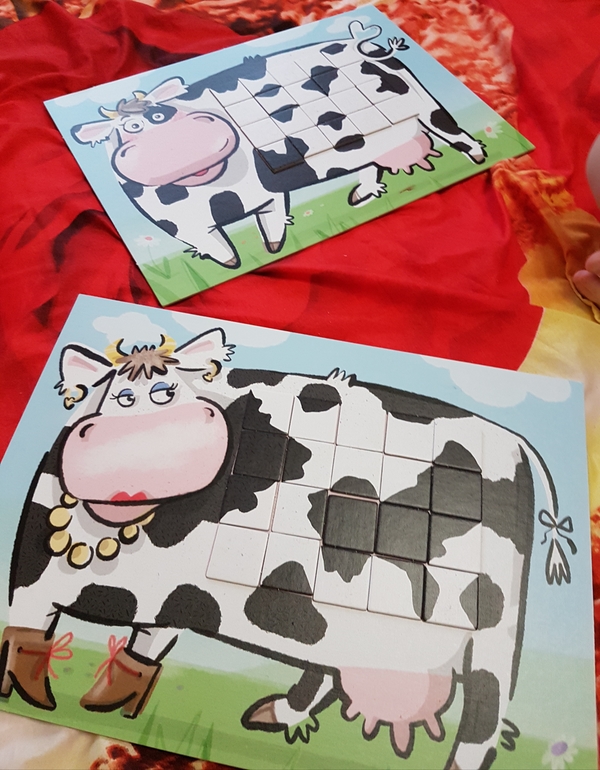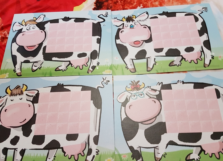 Каждый участник берет себе понравившуюся корову. Тайлы перевернуты, все одновременно тянут по одному и пытаются пристроить его на свой планшет, соблюдая простое правило. Черное к черному, белое к белому. Не получилось, тайл возвращаешь в общую кучу.