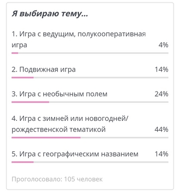 Из 105 человек ее выбрали 44%, то есть примерно 46 человек! У нас в сообществе даже нет столько активно пишущих. В связи с этим вопрос: есть ли все-таки желающие написать на эту тему обзор игры в ближайшие 2 недели? И есть ли смысл продлевать ФМ, если игры к теме будут "притянуты за уши" или обзоры будут на скорую руку после 1-2-х партий? Цель наших ФМ, как правильно написала Юля, рассказать о новых играх, поделиться впечатлениями, подсказать, что купить, чем заинтересовать детей, подобрать тематические игры. Ближе к концу декабря мы все гораздо меньше времени будем проводить в Интернете, и уж тем более не успеем заказать и получить до Нового года понравившиеся игры.