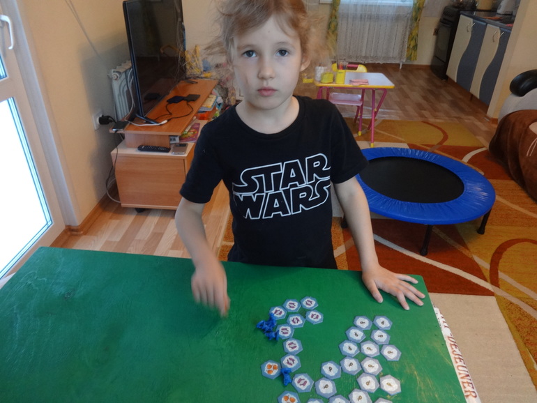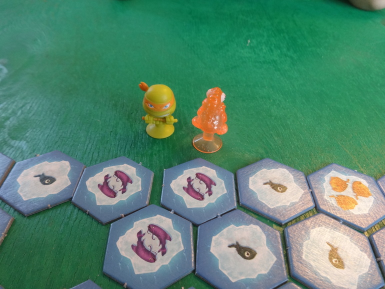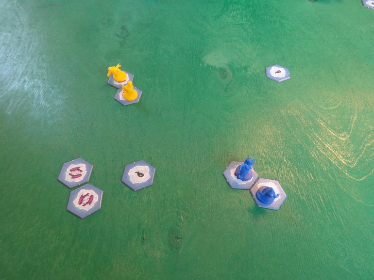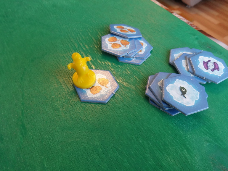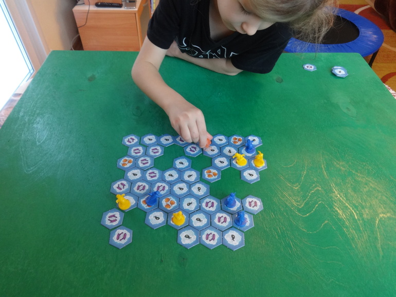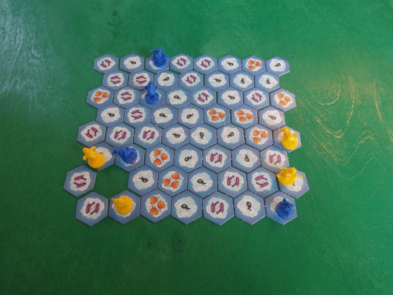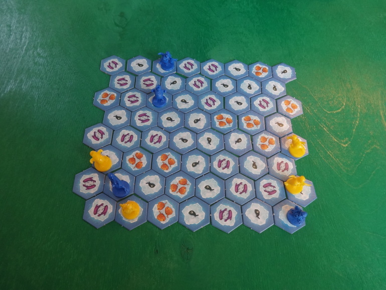 Первоначальная расстановка. Выкладываем произвольно поле (тот самый момент, который мне жутко не нравится, очень долго расставлять тайлы) , и поочередно расставляем своих пингвинов на льдины с одной рыбой: