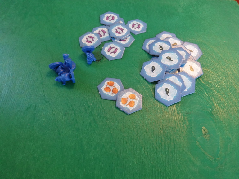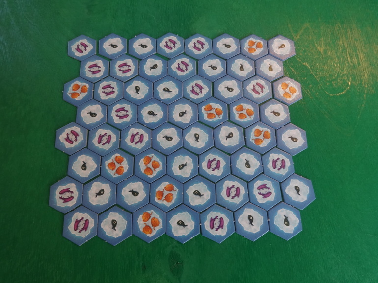 Есть поле, состоящее из отдельных тайлов с изображением рыбы достоинством 1, 2 или 3 рыбы. Смысл игры соответственно в том, чтобы в конце игры набрать как можно больше рыбы. У кого рыбы больше- тот и победил!