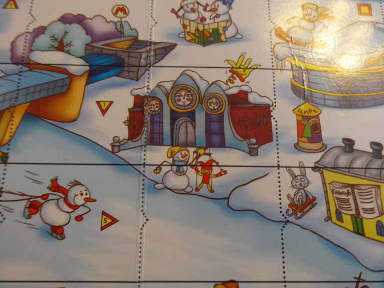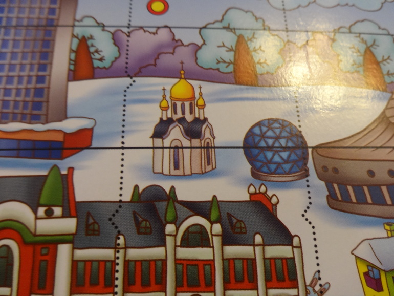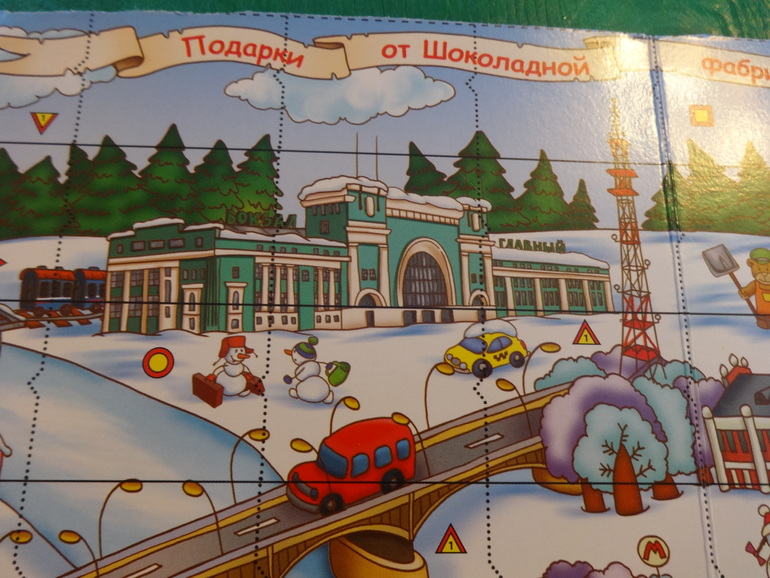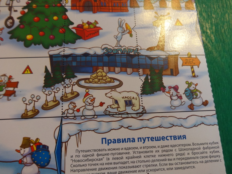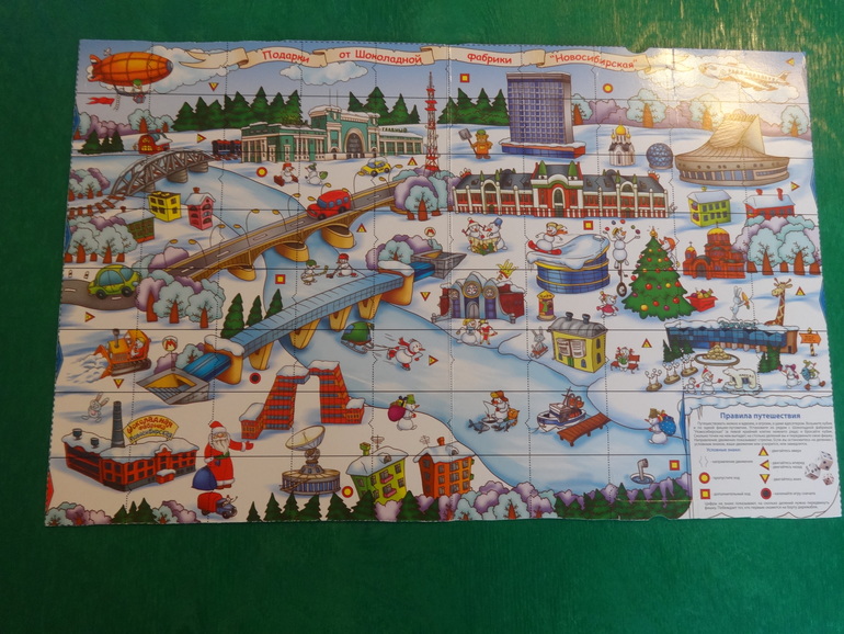 Есть у нас еще ходилка на Новогоднюю тему. Вырезала ее из большой коробки с шоколадными конфетами несколько лет назад. Ничего особенного, если не считать, что на ней Новосибирск с самыми узнаваемыми зданиями города. Новосибирцам интересно: