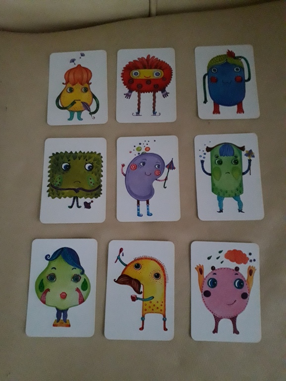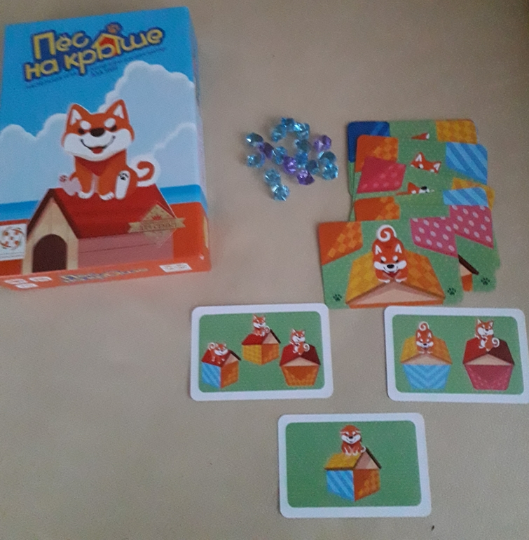 Три уровня сложности. У каждого игрока- набор из 9 двусторонних карточек, из которых нужно сложить "будку" как на карточке с заданием. В плане скорости сын мне не конкурент, но мы играем на правильность, а не скорость. Некоторые задания 3 уровня заставят и взрослого поломать голову. Есть там карточка с 3 почти одинаковыми домиками. Вот так выглялят карточки с заданиями. Кристаллики за победу, кстати, очень симпатичные.