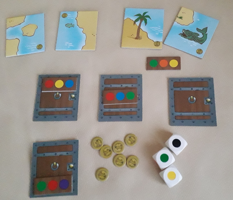 Раскладываются двери, на обороте которых расположены фрагменты карты с определенной ценностью. На каждую дверь накладывается плашка с комбинацией 3 цветов. Задача: выбрасывая 3 кубика, за 3 хода получить нужную комбинацию, забрать себе кусочек, получить монеты за свой фрагмент. Конечно, очень много зависит от везения, но все-таки надо рассуждать, какие кубики выгодно перекинуть, ведь на одном кубике есть белый цвет-джокер и черный цвет, который в зависимости от игровой ситуации трактуется по-разному.