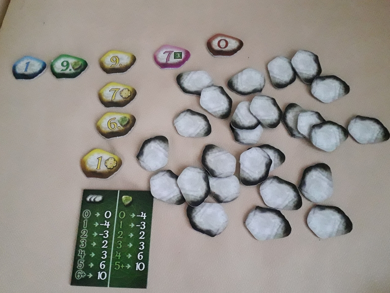 Табличка подсчета очков достаточно насыщенная. На итог влияет длина "дороги" (за слишком короткую можно и баллов лишиться, не то что "0" получить), дополнительные очки, которые написаны прямо на камнях и количество спецсимволов-"камней желаний". Это вон те, зелененькие. Клевер на камне дает право на дополнительный ход. Игра не сложная, но и не примитивная. Маркировка 7+, скорее, только из-за системы подсчета очков. С игрой сын справляется, а я задумываюсь о покупке "коровы 006".