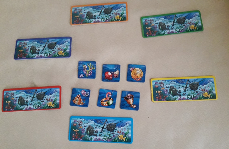 "Im Geisterschiff" -"Корабль-призрак" -мемо-игра на поиск сокровищ. Кидаешь кубик, угадываешь, что хранится на каждом корабле. Задача усложняется тем, что сокровища меняются. Всего их 6: корона, кольцо, кубок, рубин, монета, бусы.