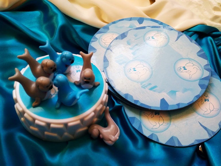 Когда игру подарили детям, у них уже была подобная с мышками и кусочками сыра. Я порадовалась, что будет зимний и летний вариант. Но качество игры заметно хуже, фигурки тюленей собираются из 3 частей,