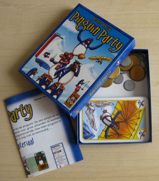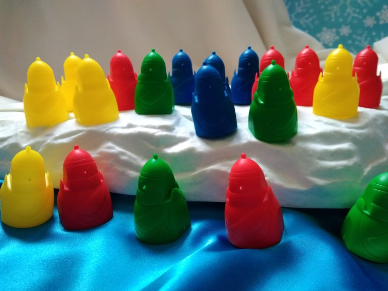Даны пингвины 4 цветов, по 9 каждого, мешочек (плохого качества), где прячутся на начало игры пингвины ,бумажные ширмы, за которыми прячут своих пингвинов игроки и жетоны штрафных очков.
