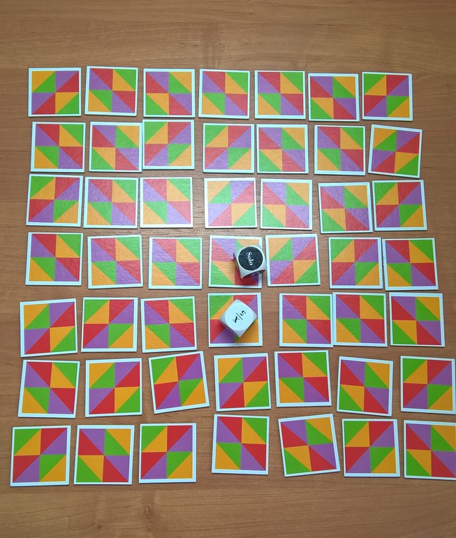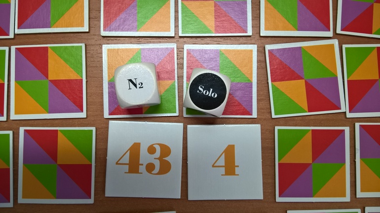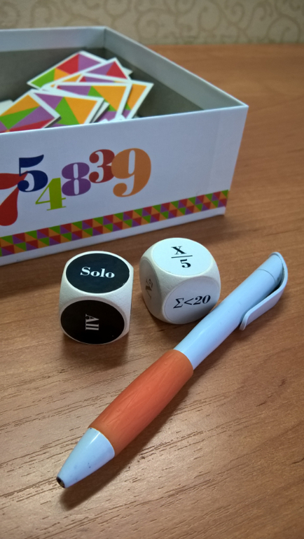 Внутри коробочки 54 карточки из плотного картона, из них 49 с числами от 1 до 49 и 5 пустых запасных, и два деревянных кубика с заданиями.