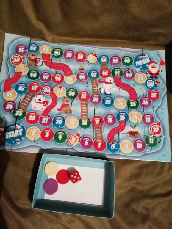 35 кусочков пазлов размером 6 на 6 см, толщиной 3 мм складываются в игровое поле 30 на 40 см. Получаем аналог игры-ходилки «Змеи и лестницы» с новогодним оформлением. Лестницы остались, а вот «спуск» совершается по шарфам. В качестве фишек плоские пластмассовые кружки и достаточно большой кубик. В последнее время дочка возлюбила всякие ходилки, и эта - самая популярная в любое время года.