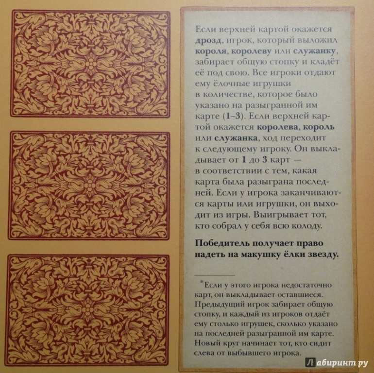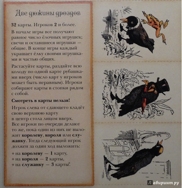 А была еще книжка, картонные игрушки и карточки для игры «Две дюжины дроздов». Там с помощью карточек как-то делились игрушки, которыми надо было украсить ёлку. В игру сыграли один раз - не произвела впечатления. Видимо, поэтому и осталась там, где играли. Вот, фото в интернете нашла.