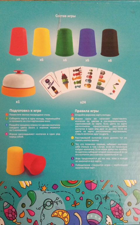 Внутри 24 карточки, 30 стаканчиков 5 цветов и звоночек, который в первый вечер очень хотелось выкинуть😱