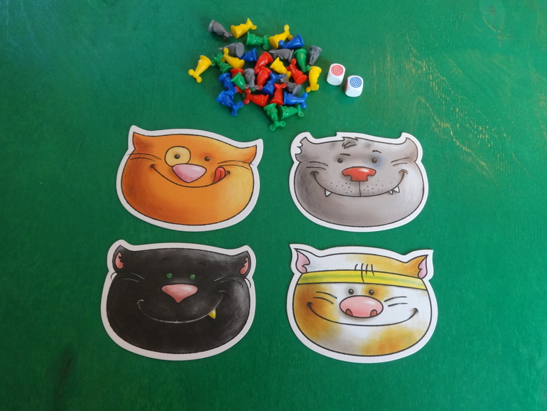 Первоначальная раскладка. Рыжий котик Янкин, серый мой, банк мышек доступный для всех игроков и кубики: