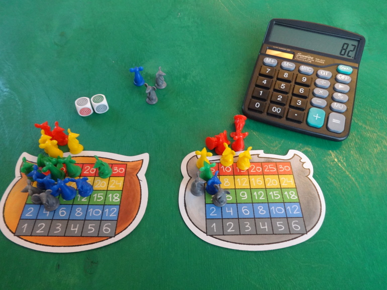 Считаем на калькуляторе, чтоб не портить приятную несложную игру муторным подсчетом очков. Мама проиграла, дочь ликует!