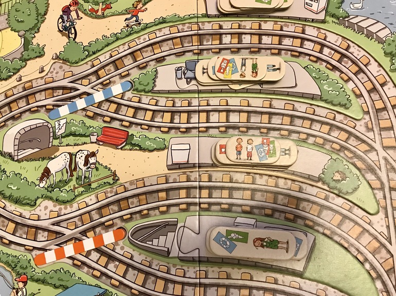 Бросаем кубик, меняем положение шлагбаума и, издавая бравое «чух-чух-чух» подбираемся к станции, доступ к которой открылся. Смотрим на верхнюю карту пассажира: если на билетиках есть наша локация, приглашаем его в купе и быстрее ветра мчим к развлечениям, высаживаем благодарного ездока и передаем право хода следующему игроку.