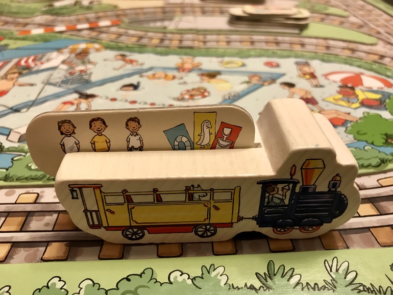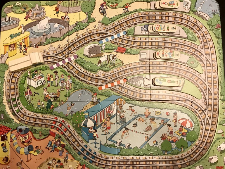 Поле-пазл из пяти частей, поле с вырубкой для рельсов. По рельсам передвигается деревянный паровозик.А на четырёх станциях уже толпятся пассажиры, мечтающие попасть в зоопарк, бассейн, парк или на детскую площадку.