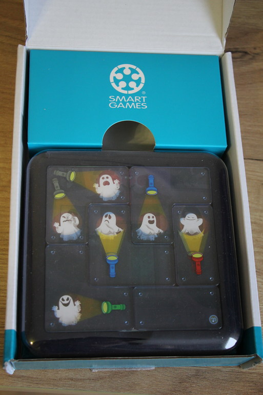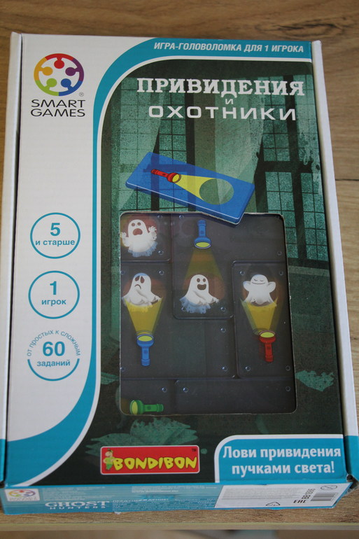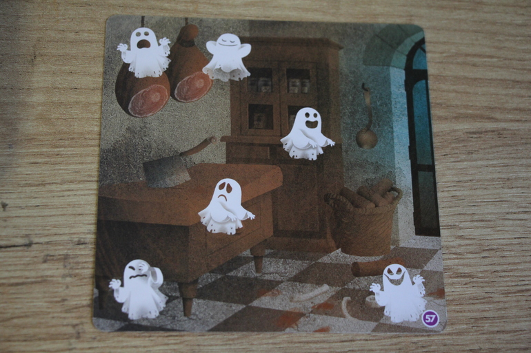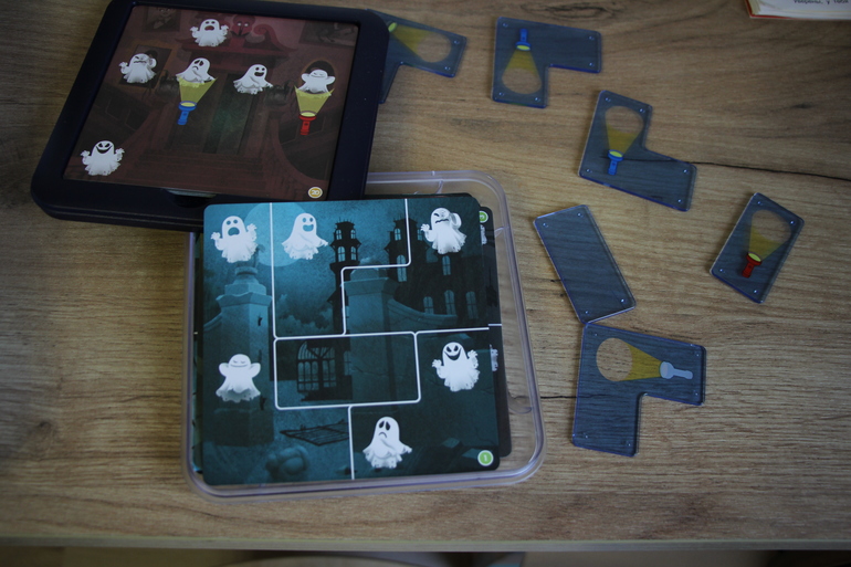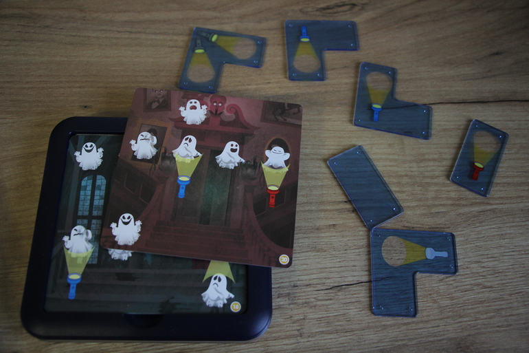 Нужно расставить прозрачные пластиковые детали с фонариками так, чтобы осветить каждое привидение на карточке задания.