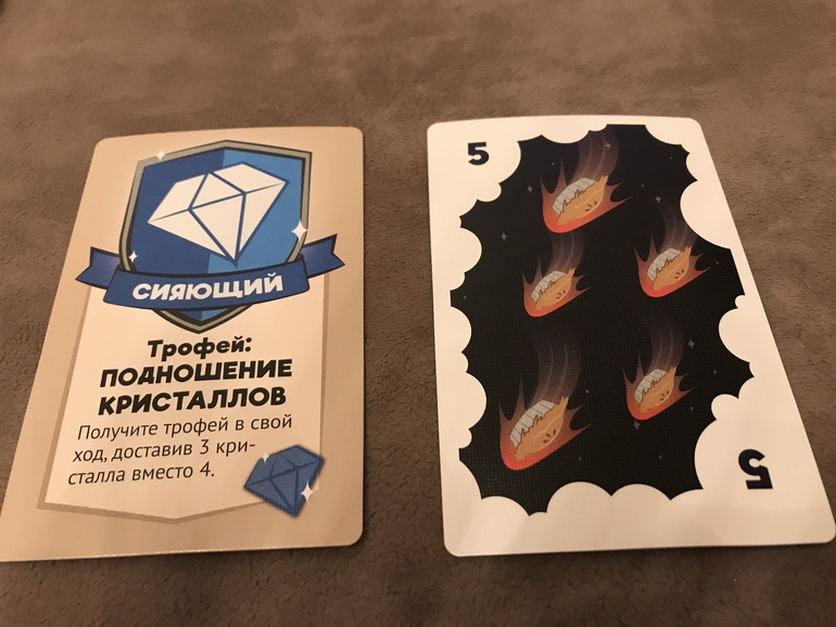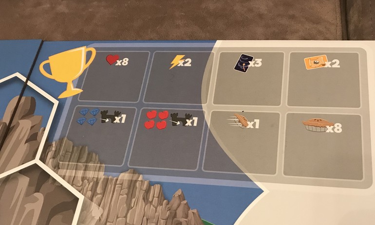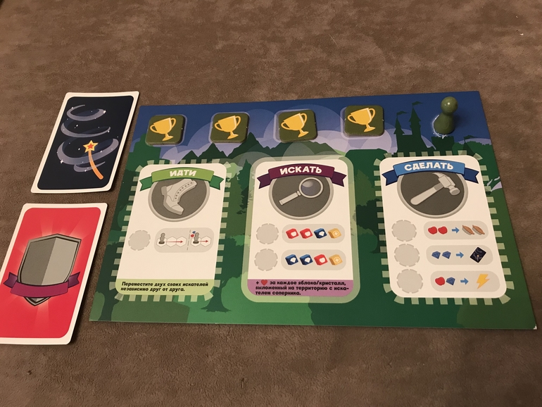 И действие «Сделать», там все понятно по пиктограммам на планшете: за два яблока, имеющихся у искателя, можно сделать два пирога, за два кристалла - одну карту заклинания, а за яблоко и кристалл - улучшение, в игре их два. Например, на этом планшете лежит мое любимое улучшение действия «Идти», которое позволяет искателю с ресурсами перемещаться на две клетки, а не на одну: