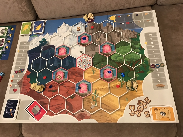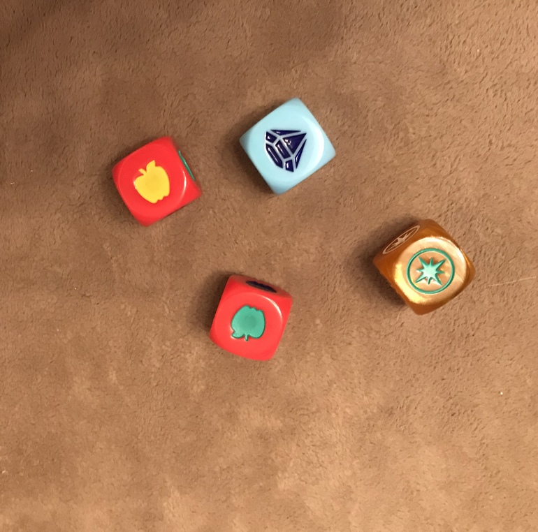 Например, при выпадении таких значений игрок выкладывает один кристалл на синюю клетку поля (болото), яблоки на зеленую (лес) и желтую (пустыня) клетки поля и одно приключение на незанятую никем и ничем зеленую клетку поля.