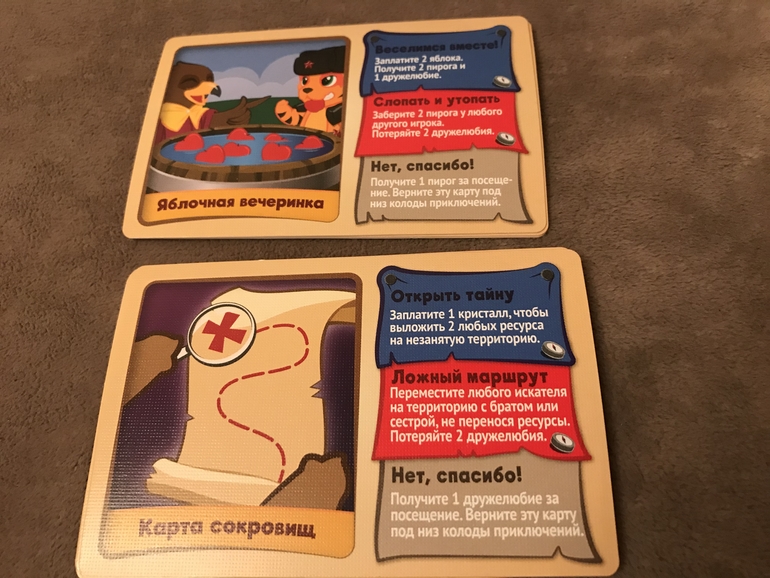 Разнообразие игре придают карты приключений, которые выполняет игрок, попав на клетку с жетоном приключений. Хотя, если честно, их бы побольше, этих карт. Примеры карт: