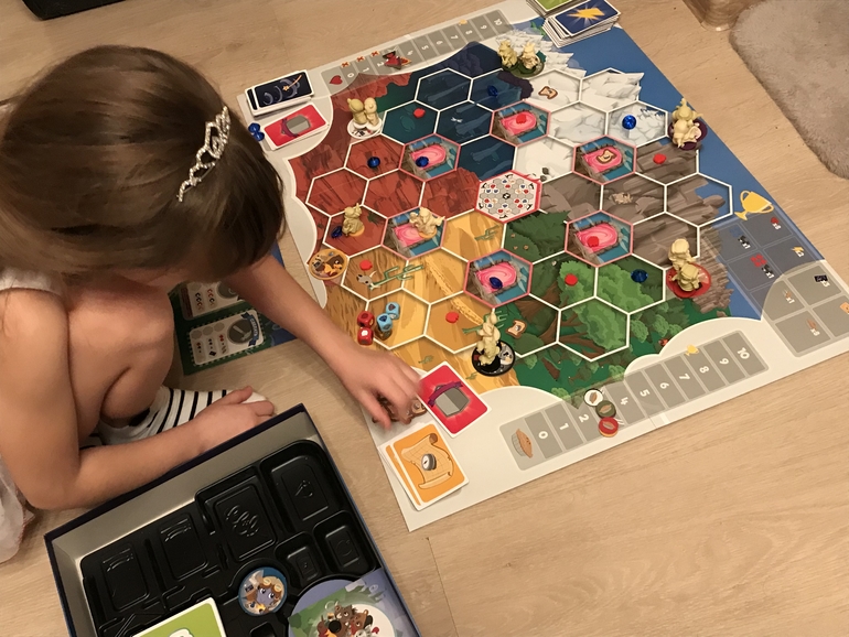 Теперь о впечатлениях. Дочке очень понравились сами фигурки, даже не смотря на то, что они не покрашены (периодически достает их из игры и играет с ними просто так). С правилами она разобралась достаточно быстро, конечно, пока что приходится подсказывать какое из трех улучшений выгоднее выбрать, как выгоднее сделать ход. Но в основном она играет сама. Поддаваться не приходится (ну, разве что ресурсы положить ее искателю - но она тоже не жадничает).