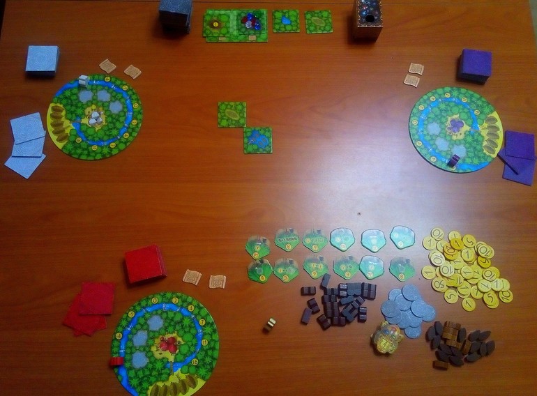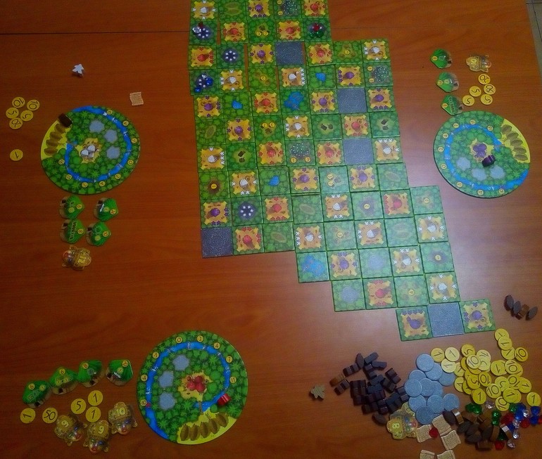 Например, за каждого рабочего можно: - собрать 1 плод какао с одиночной плантации и 2 - с двойной.(на поле деревни есть хранилище, где возможно иметь не более 5 плодов какао); - продать 1 плод какао из своего хранилища по цене, указанной на рынке; - передвинуть своего водоноса к следующему роднику ( всего 9 родников со значением от -10 до +16. В конце игры значение родника, на котором стоит водонос игрока, прибавляется или вычитается от общего количества золота). Помимо этих тайлов в игре есть "золотой рудник", жетоны солнца и даже "храмы".