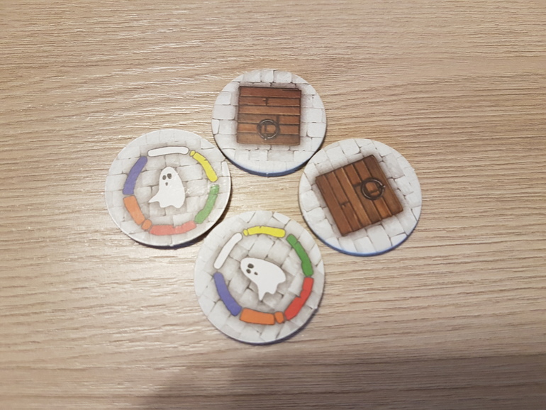 Есть в игре 4 специальных жетона, которые дают привидению дополнительные возможности - пробраться тайным ходом под стенами замка или изменить в пути цвет стен, через которые оно летит.