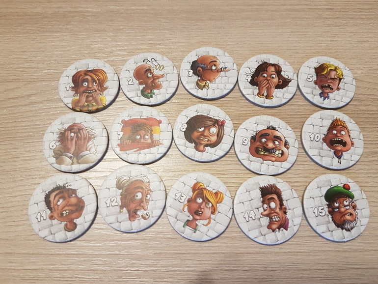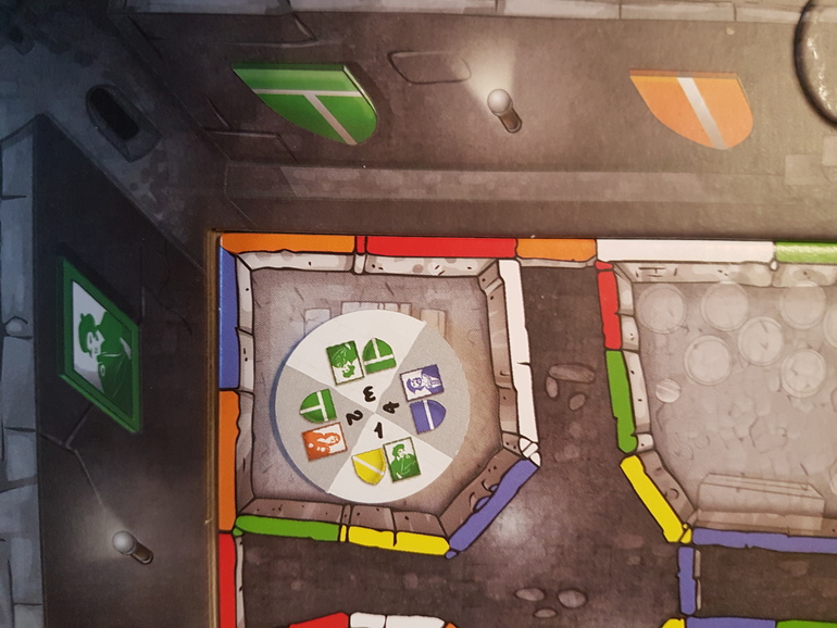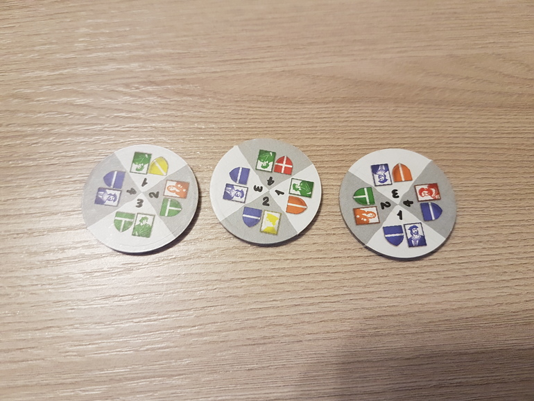 Как так выходит? Хитрым образом определяется комната, в которой появится следующий турист. С обратной стороны жетона 4 сектора с цифрами от 1 до 4. Перед началом игры игроки выбирают число (от 1 до 4), которое будут использовать в течение всей партии. Допустим, 3. Это значит, что у каждого посетителя мы смотрим сектор 3, ищем на поле соответствующие символы. К примеру, на левом жетоне в секторе 3 изображены зеленый щит и зеленый портрет.