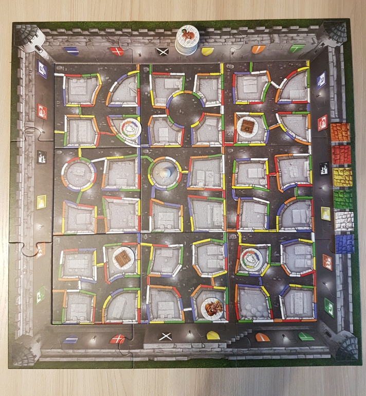 Замок собираем из стен и 9 квадратов с комнатами по определенным правилам. Квадраты каждый раз выкладываются случайным образом, так что вариантов раскладки много.