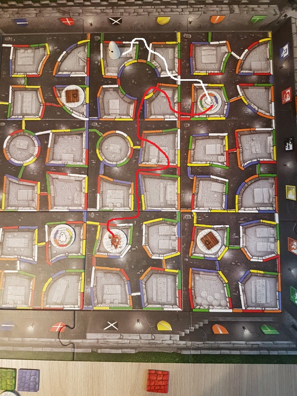 Не забываю взять себе синий "кирпичик". Теперь у меня уже есть синий и зеленый жетончики стены. Значит, оба эти цвета я не могу использовать при поиске следующего гостя. Буду использовать другой цвет, причем поменяю его в пути (но не на синий или зеленый). Полёт начинаем через белые стены, затем переходим на красные. И не забываю взять красный жетон.