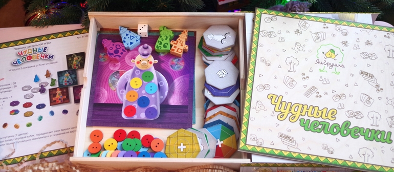 Сама коробка и все компоненты игры, кроме карточек, изготовлены из дерева! Даже кубик и тот деревянный.