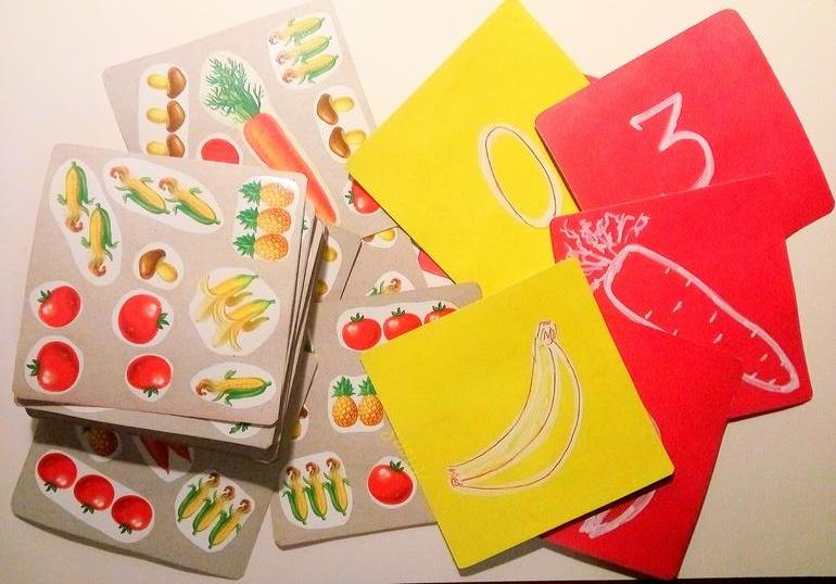 И цена была адекватная, как для такой игры, хотела купить и купила бы, а потом вспомнила, что у меня осталось много картинок овощей-фруктов, которые жалко выбросить, и решила неспешно сама сделать подобную игру. Вырезала, наклеивала овощи-фрукты. Сделала всего 24 карточки, и не прогадала. Игра длится не очень долго. Сын не успевает "устать" от игры. Например, в Доббле карточек 70 и, пока все рассмотрим, сын начинает уставать и дальше доигрывать уже не хочется (купила Дуплет от того же Артоса, печатать можно было, но цена готовой игры вполне устроила по сравнению с затратами на ее изготовление-печать).