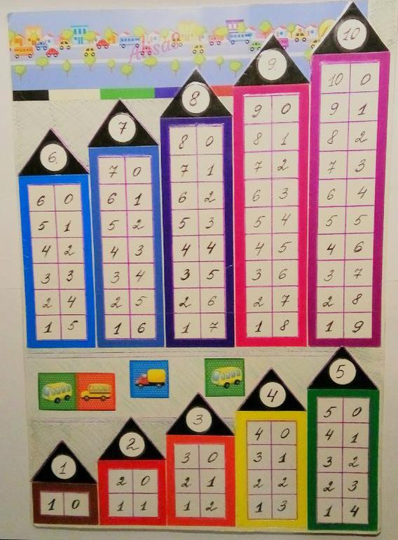 Сделали табличку-домики, в которой изображены все составляющие чисел от 0 до 10. В интернете увидела подобную табличку состав числа и мы решили сделать свою :) Вместе клеили. Можно было бы и напечатать, но совместный труд над чем-то заставляет это что-то, совместно сделанное, беречь, ну и лишний раз зрительная память.