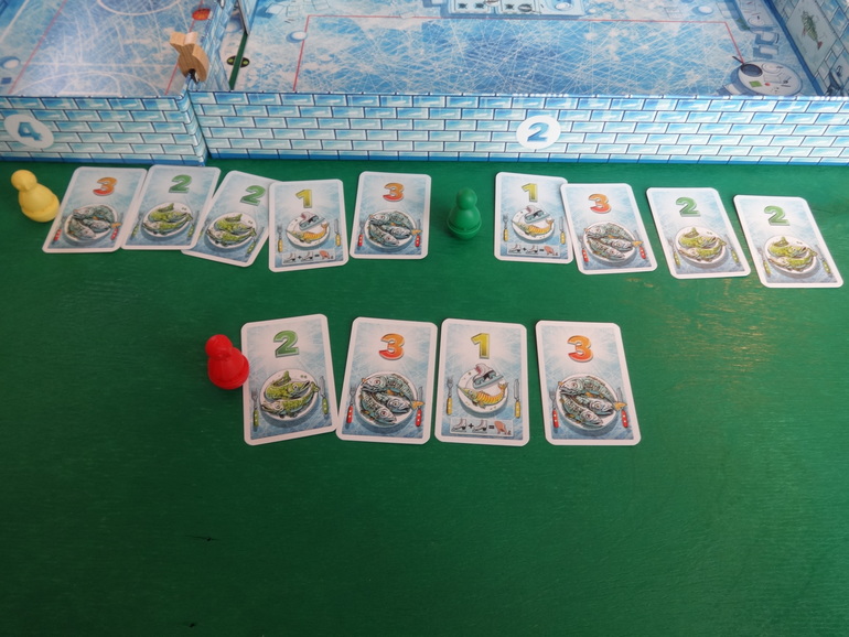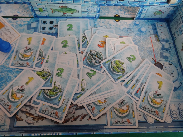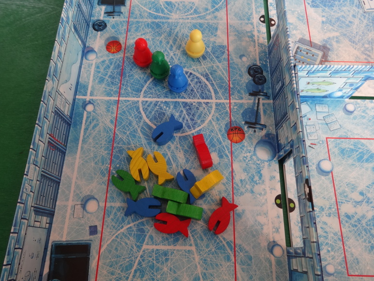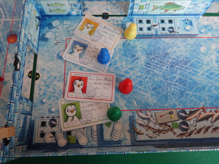 Максимум можно играть вчетвером. Есть рыбки четырех разных цветов, есть пингвины и их пропуска по школе, есть карты с победными очками: