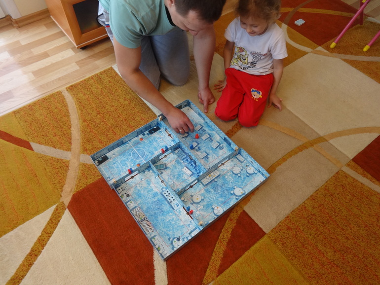 Попытались играть на полу, пока родителей паралич не разбил, за столом всё ж удобней):