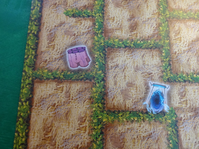 Мино и Таури, песочные часы отсчитывающие время одного раунда, карточки предметов, всего 12, по шесть с каждой стороны поля: