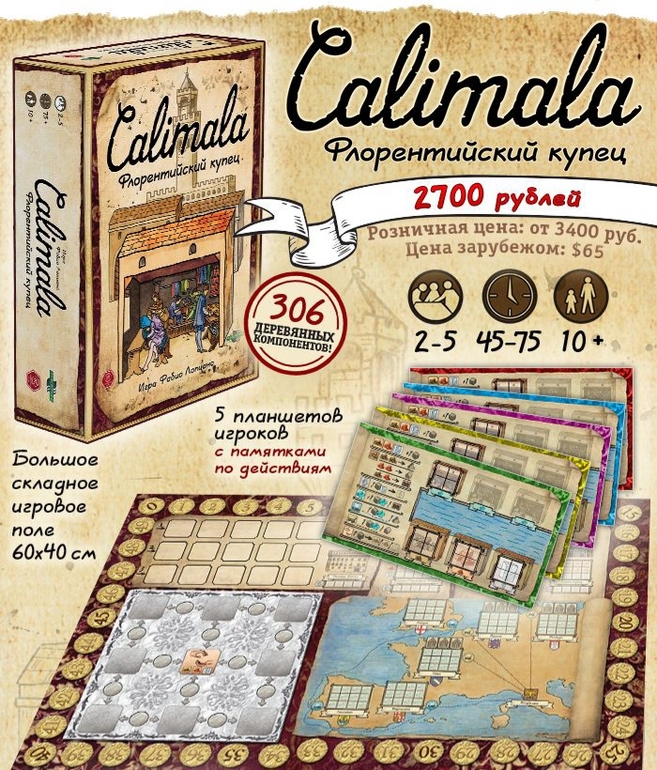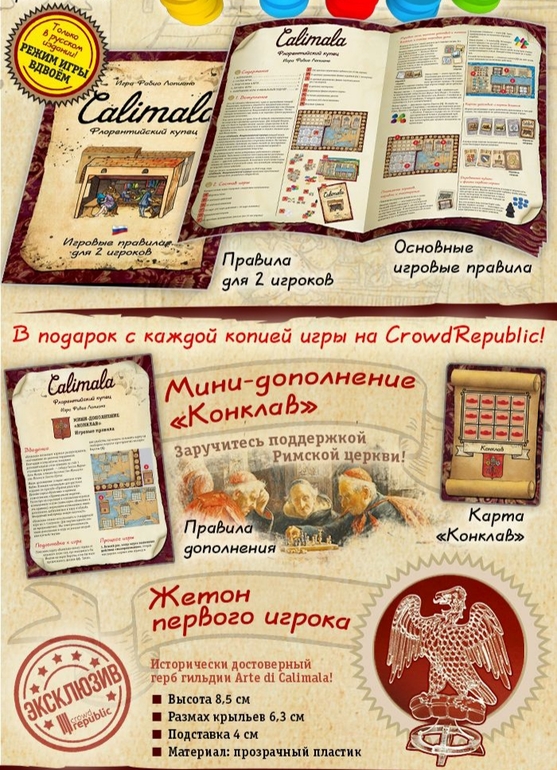 Узнать об игре в подробностях, почитать обзоры, посмотреть летсплей и оформить предзаказ можно по ссылке https://crowdrepublic.ru/project/1018164/Calimala-Florentiyskiy-kupec