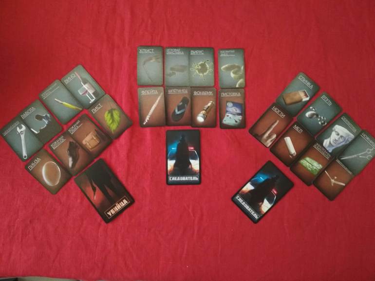 При игре маленьким составом без Сообщника и Свидетеля (меньше 6 человек), каждый игрок, кроме Криминалиста, получает по 4 карточки улик и орудий убийства. Выкладывают их перед собой в открытую. Я расскажу на примере 4 игроков, один из которых - Криминалист.