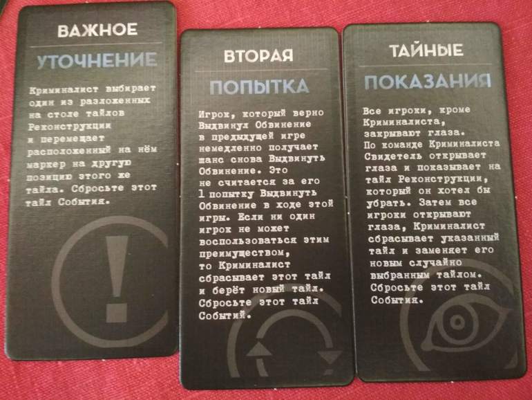 Четвертый тип тайлов - тайлы событий, это тоже небольшие подсказки. Если вы решаете, что они участвуют в игре, то их перемешивают с тайлами реконструкции и они могут выпасть во время второго или третьего круга игры.