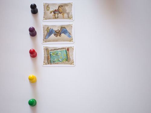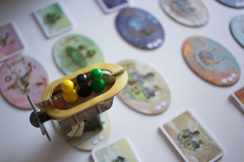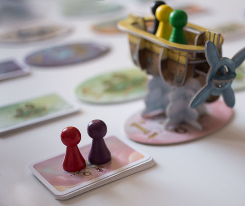 Выбираем себе жетон искателя приключений, кладем его перед собой, а фигурку искателя приключений того же цвета ставим на воздушный корабль.
