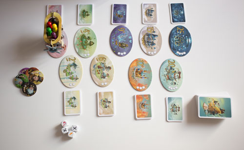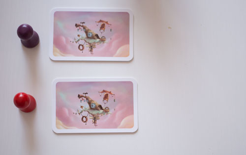 - красота и оригинальность оформления. Присутствие в игре объемной фигурки воздушного корабля мгновенно вызвало огромный интерес у детворы. Моя же особая любовь - красочные карты снаряжений и тайлы городов;