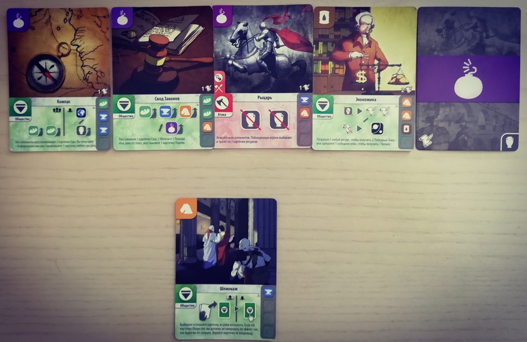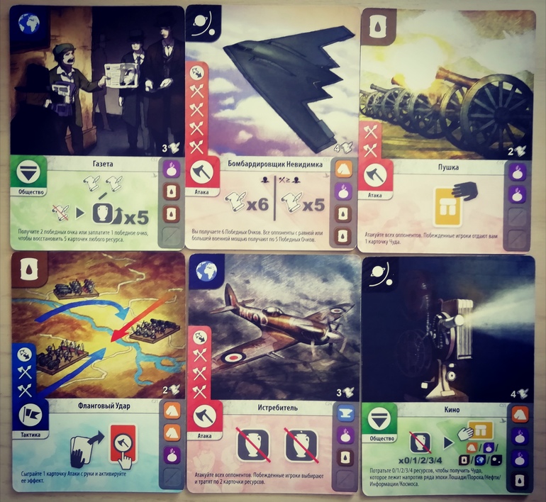 Даже в эпоху пороха и нефти первобытные ресурсы все еще полезны. Хотя все меньше и меньше, появляется ощущение, что они засоряют руку. Все больше появляется карточек (в дополнении), которые дают победные очки (значок свитка с циферкой).