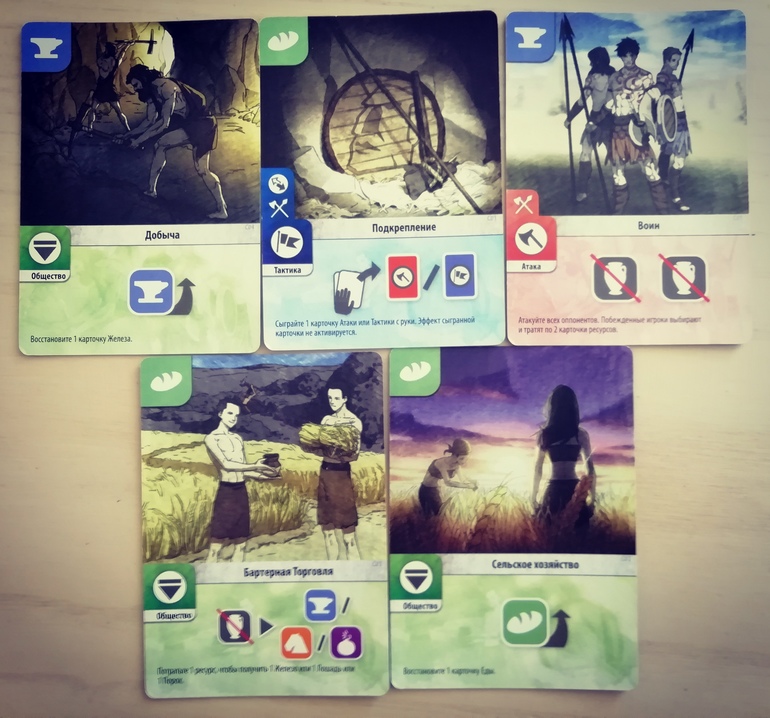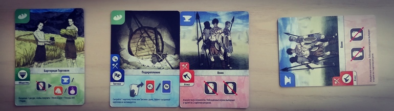 Фаза ресурсов не так проста. Можно выложить карту атаки и при атаке противника ее перевернуть, активировав значок военной мощи. Напоминает рыбу-удильщика в засаде из зеленой эволюции.