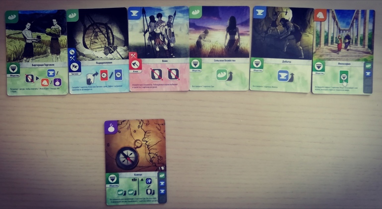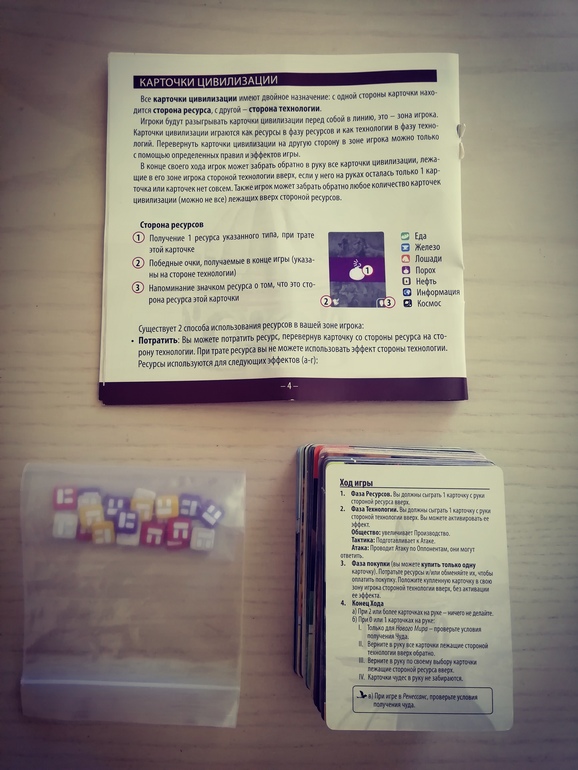 Суть:. Каждый игрок получает по 5 одинаковых карточек. Каждая карточка в игре имеет две рабочие стороны. На одной изображены ресурсы, которыми можно расплачиваться. На другой - технологии. Ресурсы "хлеб" и "железо" встречаются только на первых пяти карточках, хотя в первой половине игры они весьма полезны. Все стороны технологий разные, повторов (кроме начальных) нет. Чтобы взять карточку из пирамиды в свое постоянное владение, надо расплатиться ресурсами (чаще двумя-тремя). Перевернув ресурс, остался без него. Вечный экономический кризис... Некоторые карточки технологии позволяют перевернуть карточку на сторону ресурса, или активировать имеющиеся технологии еще раз. Когда карточки на руке почти закончатся, надо забрать все карточки, смотрящие технологией вверх, на руку и начинать выкладку сначала. Карточки, лежащие ресурсами вверх, можно оставить.