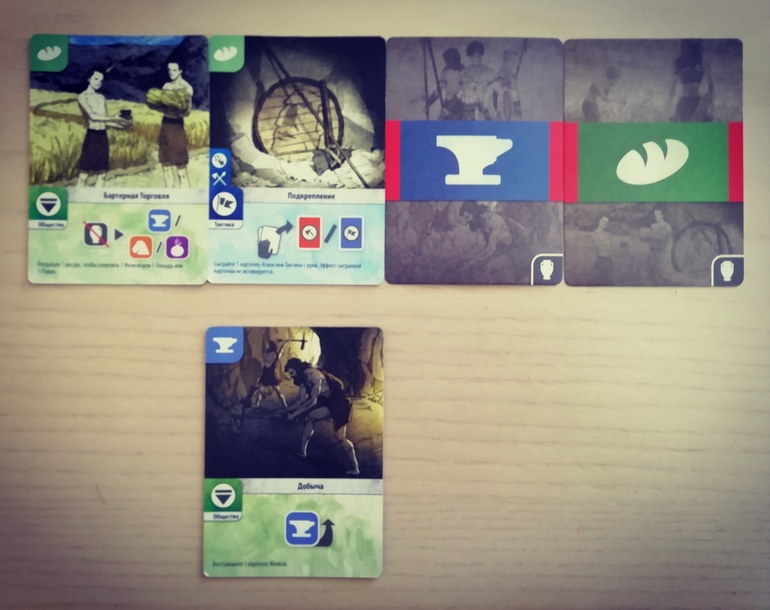 Продолжаем: на следующий ход в фазу ресурсов добавлен хлеб, в фазу технологии разыгрываю карточку добычи и восстанавливаю ресурс "железо" (переворачиваю карточку атаки стороной вверх). Теперь я могу купить что-нибудь за железо и/или хлеб. Я богата!