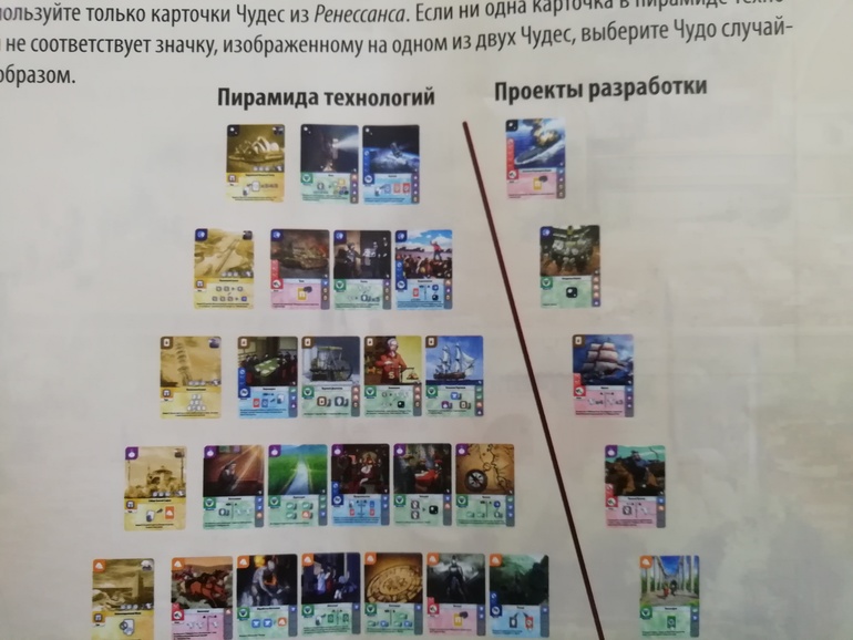 Историческая модель понравилась: сначала (первый ряд пирамиды) мы умеем только хлеб выращивать, железо обрабатывать да на конях скакать, затем изобрели порох, потом поняли, чем полезна нефть, и вот уже бех информации никуда и... Космос! Карточки каждого ряда сильнее, чем предыдущего. (по опыту: оказывается достаточно бессмысленной и проигрышной стратегией развиваться традиционалистски и не стремиться к прогрессу).