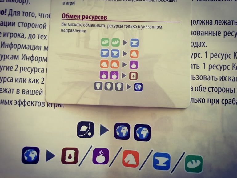 Ресурсы можно менять по сложной схеме. Не так часто приходится это делать, потому что ресурсов никогда не бывает в избытке. Ресурс "информация" автоматически равен любому ресурсу (джокер), ресурс "космос" - двум любым ресурсам. Но я видела информацию в своих руках толькo в базовой игре...