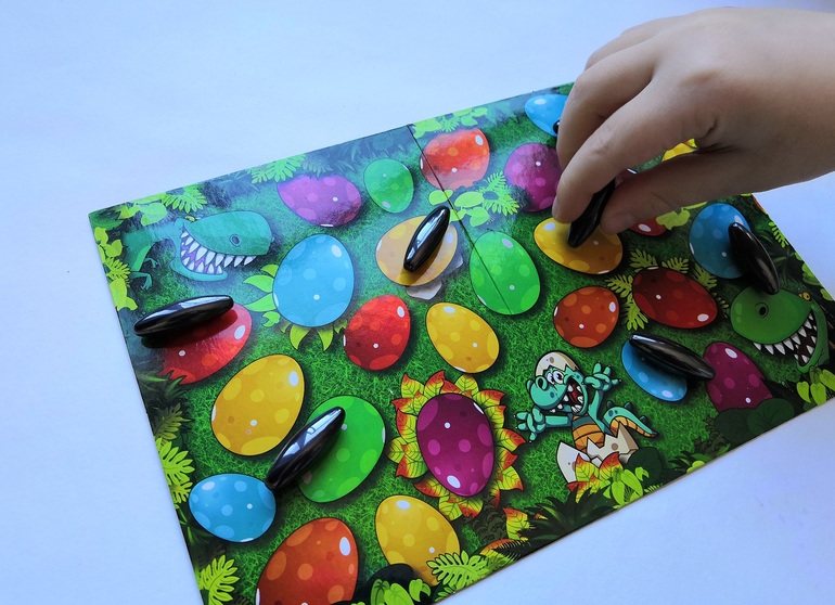 Выложить свой магнит надо на цвет яйца, выпавший на кубике, и так, чтобы он другие магниты к себе не притянул. Столкнулись магниты или убежали за пределы поля, забирай все себе на руки.
