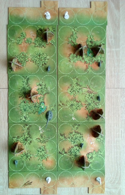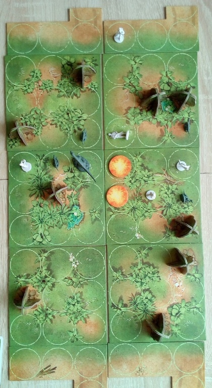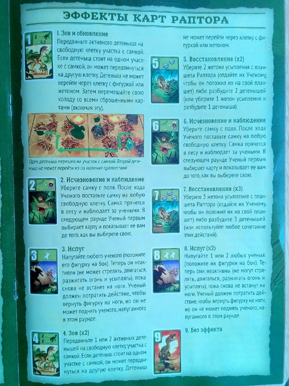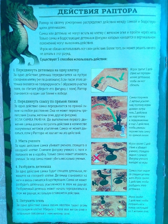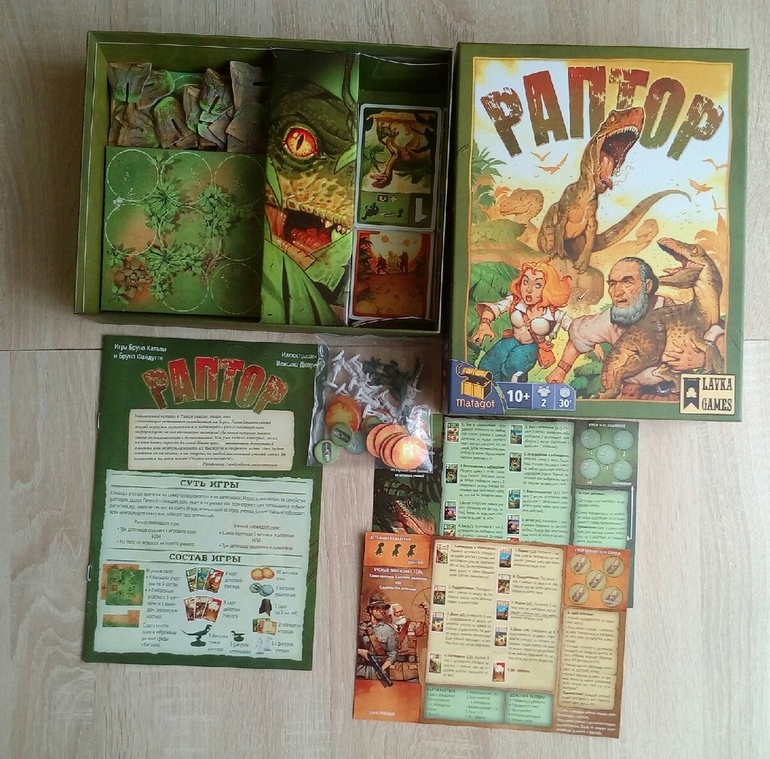 Раптор берет: планшет Раптора, 9 карт действий Раптора, фигурку самки раптора и 5 фигурок детенышей. Раптор выставляет фигурки самки и детенышей на поле.